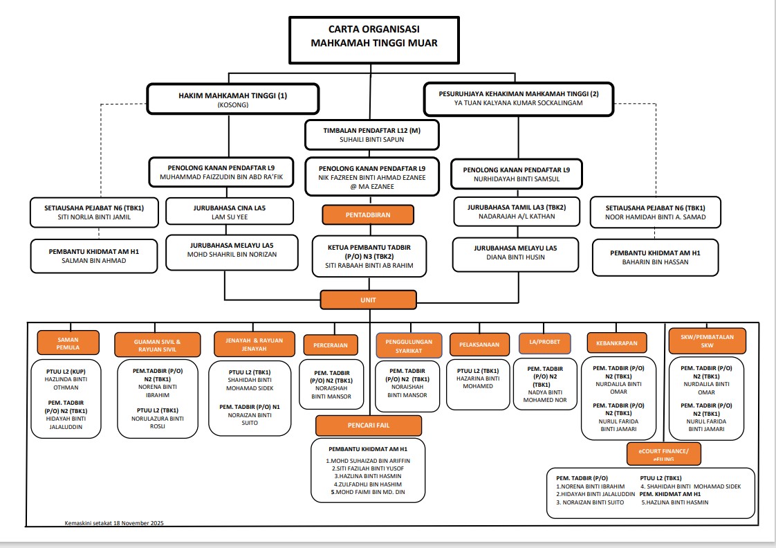 Pejabat Pendaftaran Mahkamah Tinggi terdiri daripada dua bahagian iaitu Bahagian Pendaftaran Mahkamah Tinggi Sivil dan Bahagian Pendaftaran Mahkamah Tinggi Jenayah.